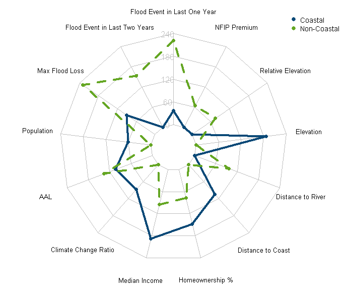 Figure 1 highlights the primary variables that drive voluntary flood insurance purchasing patterns in both coastal (blue solid line) and noncoastal (green dashed line) census tracts. The further out on the axis each line extends, the more important the variable are to predicting flood insurance take-up rates.