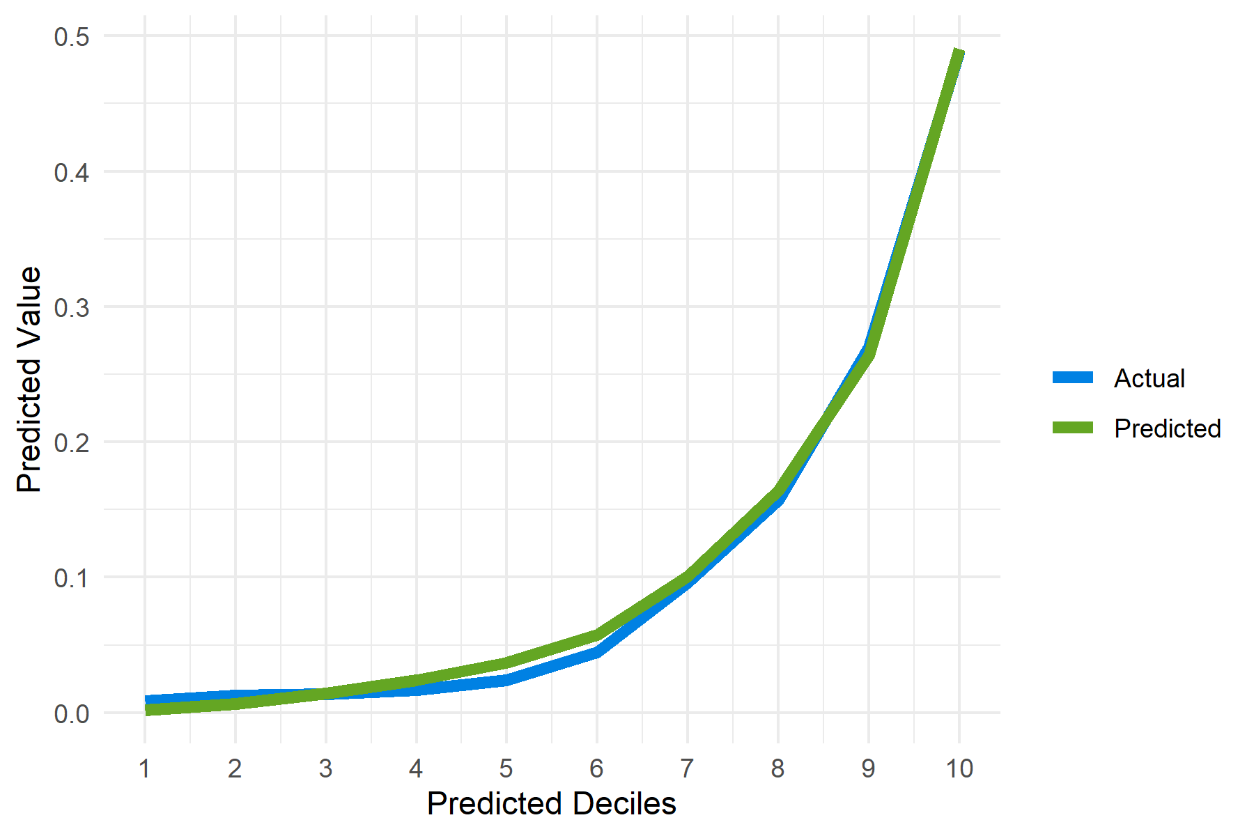 A commonly expressed concern of private insurers is that flood insurance consumer demand is limited across the country. However, many within the insurance industry do not realize that flood insurance is voluntarily purchased at a high rate in many areas of the country today. As shown in Figure 2, the top 10% of coastal census tracts have a combined take-up rate of almost 50% (outside of the SFHAs). The two lines shown in Figure 2 are averaged values of the observed take-up rate (blue line) seen in the data, alongside our predicted value (green line) from the model. The overlapping of the two lines demonstrates our model’s ability to systematically understand the underlying phenomenon in the data and report an accurate take-up rate based on the underlying variables. This means that not only do flood insurance take-up rates vary at a high level across localities, but that there is a systematic pattern to this variation that can be explained by flood-relevant risk, demographic, and geographic data. A similar plot for our noncoastal model would have a smaller range of take-up rates, 0.2% to 10%. While this is still a good amount of variation, it also reflects the overall lower take-up rate outside of coastal areas.