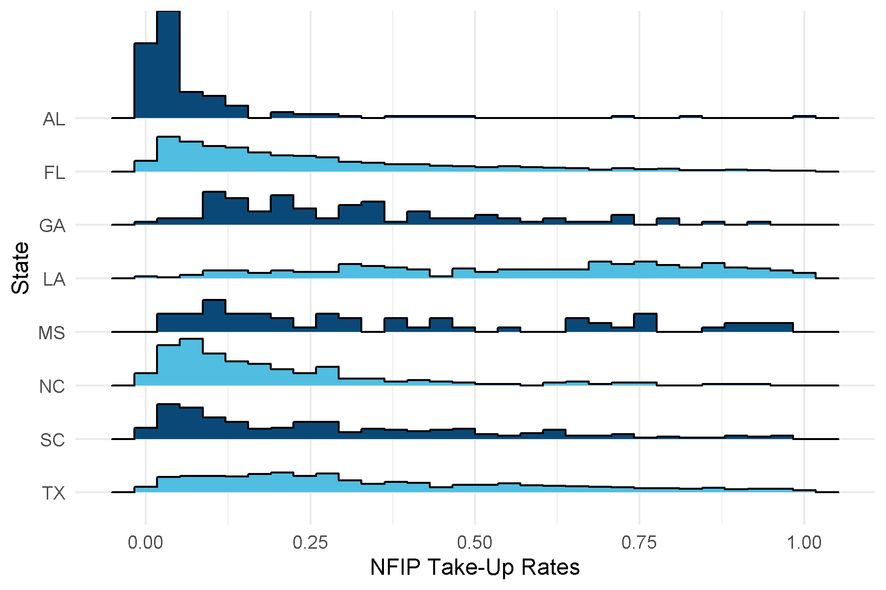 This wide disparity in take-up rates is even more pronounced at the state level. Figure 3 shows the distribution of coastal take-up rates for important flood states in the southeastern United States. Each line is the histogram of census tracts with that take-up rate level. The distribution in Louisiana demonstrates how widely the take-up rates can vary within a single state. The long tails for all of these states show that large market penetration is possible, but not currently widespread. Our take-up rate model can help identify the areas with the best potential for market penetration.